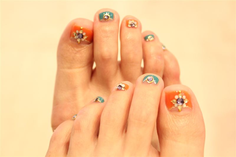 左の足のS様はハンドはジェルネイル、フットはいつもネイルラッカーのカラーリングです。