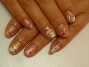 右はお得意様のK様の足。こちらも淡いピンクのラメ入りカラーにエンボスのバラ。