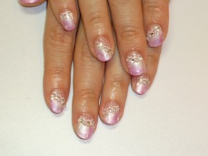 春色ピンクのグラデーションに流れるようなラメと、根元のスワロで可愛く仕上がりました。